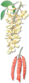 Descripcion: arbol de la familia de las Leguminosas de 4 a 20 metros de altura, con ramas provistas de largas espinas afiladas. Las flores son blancas, en racimos colgantes, muy aromaticas y de sabor dulzon.