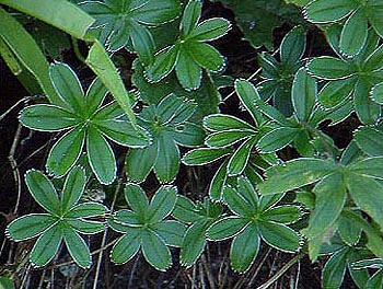 La alquimila alpina es una planta herbacea que pertenece a la familia de las rosaceas. Sus hojas se encuentran partidas en varios gajos, normalmente 5 o 7, que llegan hasta su centro. Tienen un color verde oscuro y son totalmente lisas, sin vello en su cara superior mientras que por el reverso estan recubiertas por un fino vello que se encuentra muy bien repartido por toda la hoja, formando una capa uniforme que las hace relucir.