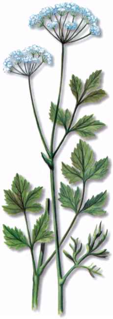 Umbeliferas, con tallo estriado y flores blanquecinas agrupadas en