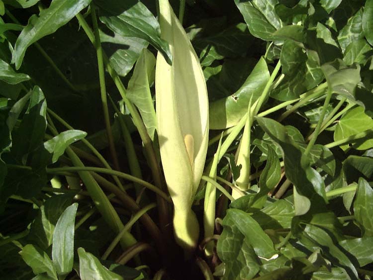 En la base del espadice aparecen las flores con pistilo y arriba las flores con estambre. Esta inflorescencia despide un nauseabundo olor para los humanos, pero en cambio atrae a los insectos polinizadores.