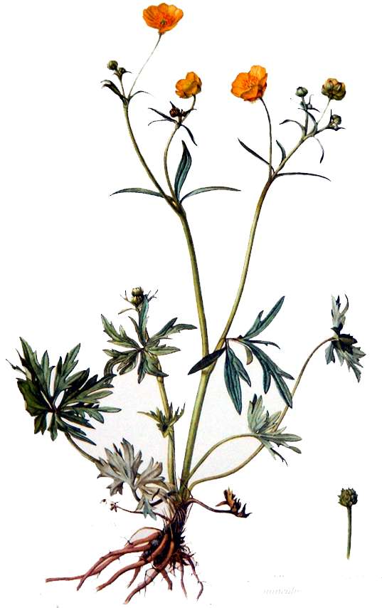 De un rizoma engrosado y muy corto surge un tallo erguido que llega a alcanzar una altura de 30 y 100 cms. Es hueco por abajo ramificado y algo peludo. En el extremo de las ramas se encuentran las flores de color amarillo dorado muy vivo. Las hojas tienen distintas configuraciones. Las de la base son largamente pecioladas y divididas en cinco o siete foliolos. Son de seccion dividida e irregularmente entallada. Las hojas del tallo son sencillas y las de la parte superior carecen de peciolo. Es frecuente encontrarla en prados.