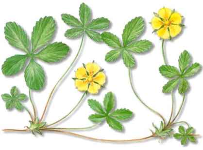 Descripcion: se trata de una planta rastrera, de hasta un metro de altura, de la familia de las Rosaceas, que se caracteriza por sus hojas divididas en 5 foliolos. Las flores son amarillas, y tambien tienen 5 petalos. Partes utilizadas: el rizoma (tallo subterraneo) y la raiz.
