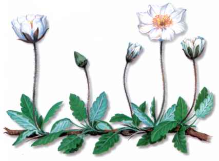 Descripcion: planta vivaz, de la familia de las Rosaceas, de 5 a 15 cms. de altura. Su tallo es leñoso y rastrero, y las hojas recuerdan a las del roble, aunque son mas pequeñas. Las flores son grandes, solitarias, con 8 petalos y estambres amarillos.