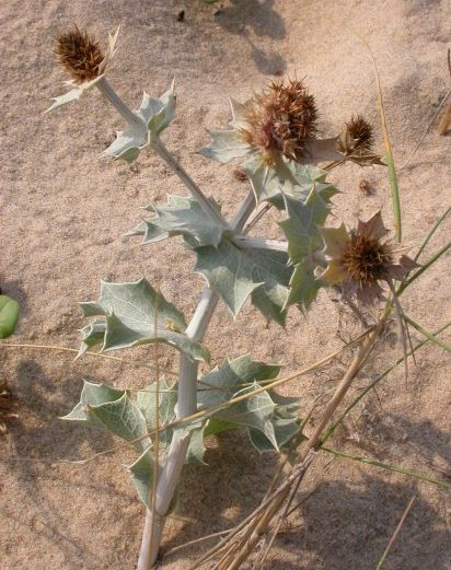 El eringio maritimo es una hierba vivaz, de porte aun mas recio que el cardo corredor, al cual se asemeja desde el punto de vista morfologico. Las hojas son bastante coriaceas, de color verde garzo, blanquecinas y muy espinosas. Las flores se agrupan en unas cabezuelas muy grandes que toman un bonito color azulado. Debajo de cada una de las flores se forman una especie de estrellas de hojas anchas, divididas en gajos mas profundos. Esta hierba se cria solamente en los arenales maritimos.