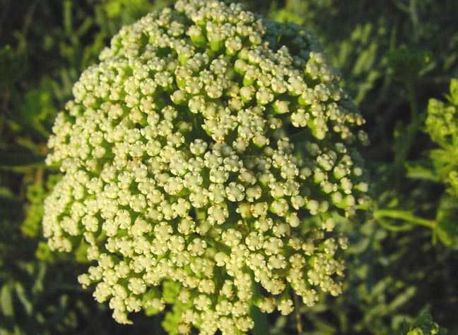El hinojo marino es una planta herbacea provista de rizoma rastrero y tallo flexible, poco ramificado, estriado, de color verde glauco. Tanto el tallo como las ramas rematan en una inflorescencia en umbela compuesta por flores blancas o amarillo-verdosas.