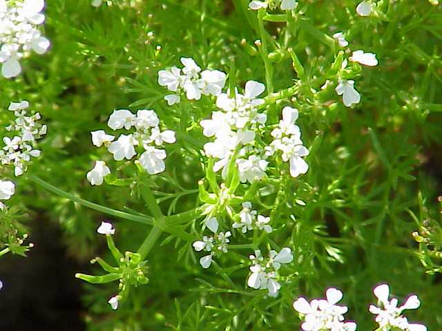 Las flores son blancas y poseen unos petalos acorazonados, siendo de mayor tamaño los situados en la periferia de las umbelas. El fruto es un aquenio negro, brillante, de forma conica y alargada. En forma silvestre se encuentra en el sur de Rusia y en diversos territorios del occidente de Asia, aunque tambien se cultiva en gran parte de Europa.