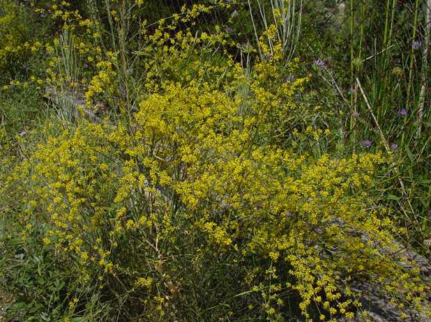 La retama comun es un arbusto de uno a dos metros de altura, con infinitas ramas mimbreñas, sedosas y diminutas hojas en el apice que se desprenden prontamente del arbusto. A lo largo de las ramas mas antiguas nacen racimos de flores de muy pequeño tamaño y de color amarillo.