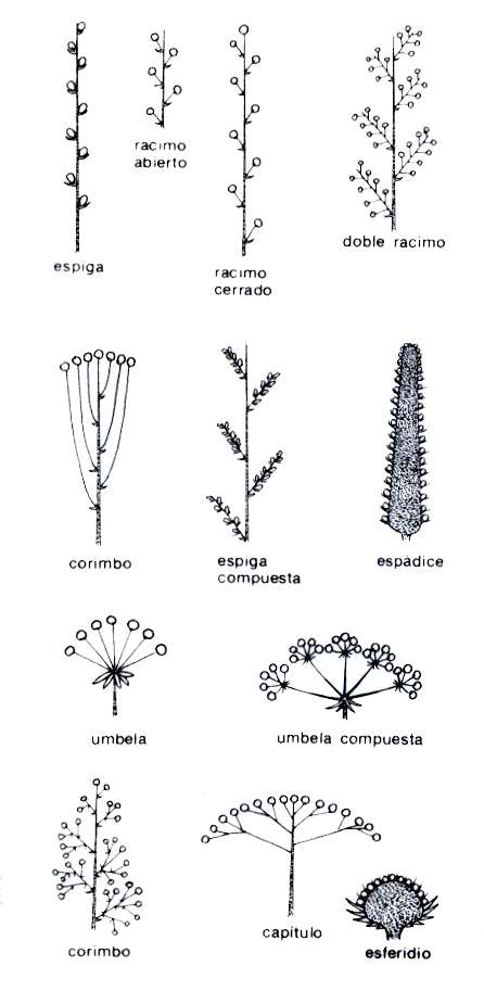 espadice, capitulo, umbela, umbela compuesta, panicula y corimbo. Hay