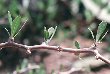Arbusto que mide de 50 cm. a 1 m. de altura o mas, suculento, con las ramas rojizo-morenas. hojas comunmente fasciculadas, que miden 1-7 cm. largo, lineares o espatuladas, enteras o trilobuladas. flores rosadas, fasciculadas, sesiles o pediceladas. fruto globoso, de unos 15 mm. con una semilla redondeada y oscura. En su interior el tallo contiene un jugo incoloro y astringente.